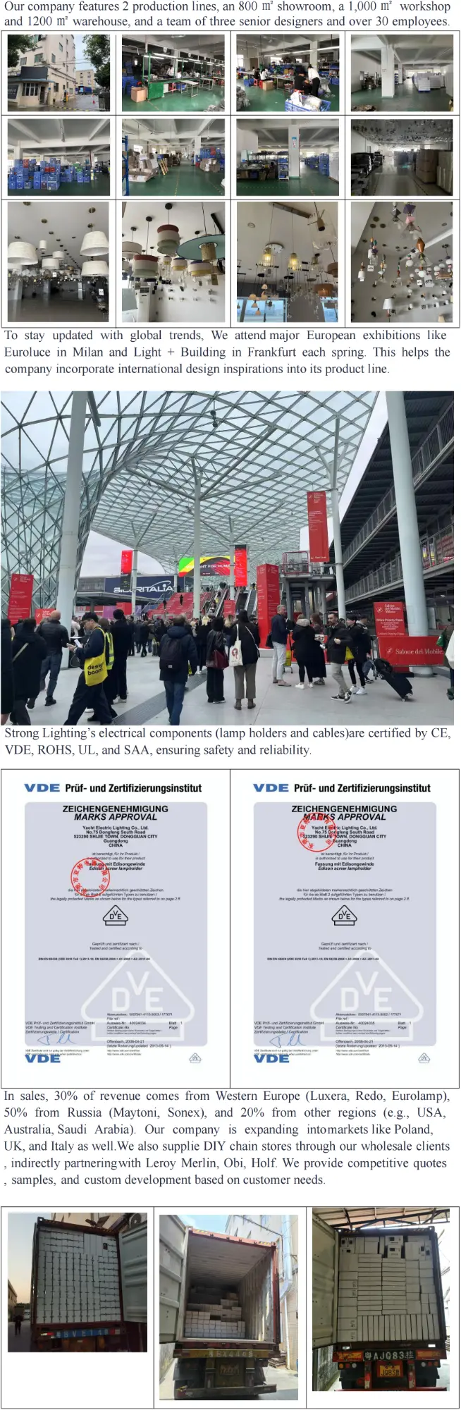 Kita kanthi bangga ngladeni jeneng global kaya Leroy Merlin lan OBI, mbangun reputasi kanggo desain sing apik banget, kualitas awet, lan pangiriman tepat wektu. Wiwit 2015, Strong Lighting wis darmabakti kanggo nggawe solusi pencahayaan sing nggambarake gaya pribadi. 3,000+ produk kita kalebu klasik nganti kontemporer, bahan campuran kaya kaca, logam, lan kristal kanggo nggawe potongan fungsional sing inovatif.
