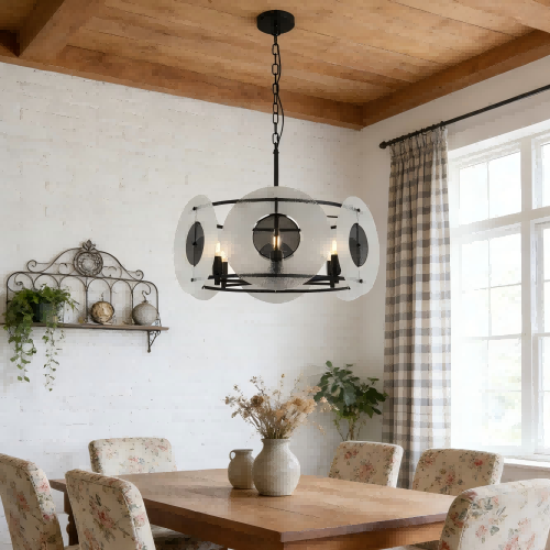 Dibangun kanthi pigura wesi ireng matte sing kuwat, lampu gantung kaca ireng matte iki nduweni warna kaca gula bunder lan bolong logam honeycomb, nggawe estetika lapisan sing nggumunake ing ngendi cahya nyebar kanthi lembut liwat kaca tekstur nalika bolong nambah pinggiran industri.